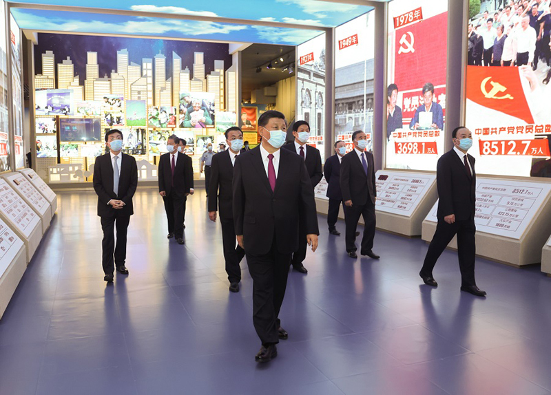 新近落成的中國(guó)共產(chǎn)黨歷史展覽館巍然矗立,氣勢(shì)恢宏。下午3時(shí)20分許,習(xí)近平等黨和國(guó)家領(lǐng)導(dǎo)同志來(lái)到這里,步入展廳參觀展覽。展覽以“不忘初心、牢記使命”為主題,精心設(shè)計(jì)了“建立中國(guó)共產(chǎn)黨 奪取新民主主義革命偉大勝利”、“成立中華人民共和國(guó) 進(jìn)行社會(huì)主義革命和建設(shè)”、“實(shí)行改革開(kāi)放 開(kāi)創(chuàng)和發(fā)展中國(guó)特色社會(huì)主義”、“推進(jìn)中國(guó)特色社會(huì)主義進(jìn)入新時(shí)代 全面建成小康社會(huì) 開(kāi)啟全面建設(shè)社會(huì)主義現(xiàn)代化國(guó)家新(人民日?qǐng)?bào))征程”4個(gè)部分,通過(guò)2600余幅圖片、3500多件套文物實(shí)物,第一次全方位、全過(guò)程、全景式、史詩(shī)般展現(xiàn)中國(guó)共產(chǎn)黨波瀾壯闊的百年歷程,濃墨重彩地反映黨的不懈奮斗史、不怕?tīng)奚贰⒗碚撎剿魇贰槊裨旄J贰⒆陨斫ㄔO(shè)史,使人們深刻認(rèn)識(shí)到紅色政權(quán)來(lái)之不易、新中國(guó)來(lái)之不易、中國(guó)特色社會(huì)主義來(lái)之不易,深刻認(rèn)識(shí)到中國(guó)共產(chǎn)黨為什么能、馬克思主義為什么行、中國(guó)特色社會(huì)主義為什么好。