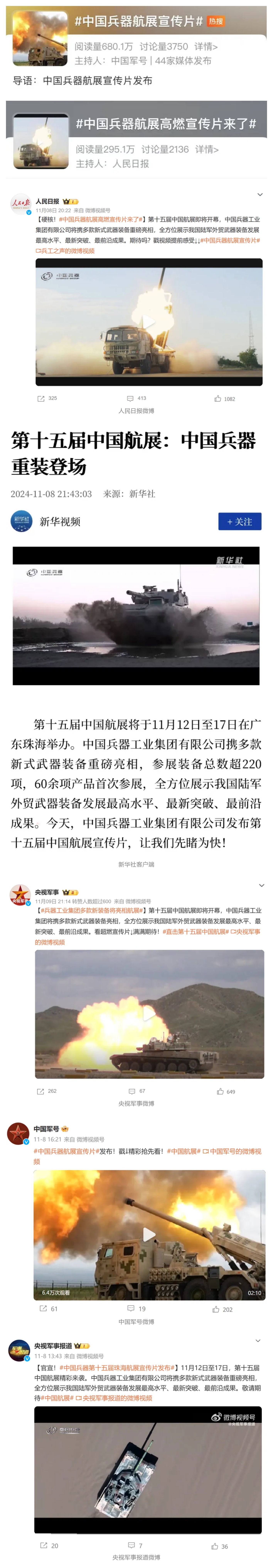 人民日報微博、新華社客戶端、央視軍事微博、中國軍號微博、央視軍事報道微博、中國日報微博、中國新聞網、中國青年報-青蜂俠、環球網、環球時報(臉書、X平臺)、學習強國中央企業學習平臺、共青團中央微博、國資委網站等20余家中央主流媒體、國家部委的新媒體第一時間播發集團公司航展宣傳片等視頻作品燃爆全網,累計閱讀量突破1200萬人次。集團公司微信公眾號、微博、抖音號、快手號、微信視頻號、知乎號等新媒體宣傳片播放閱讀量近1000萬人次,點贊近20萬人次。